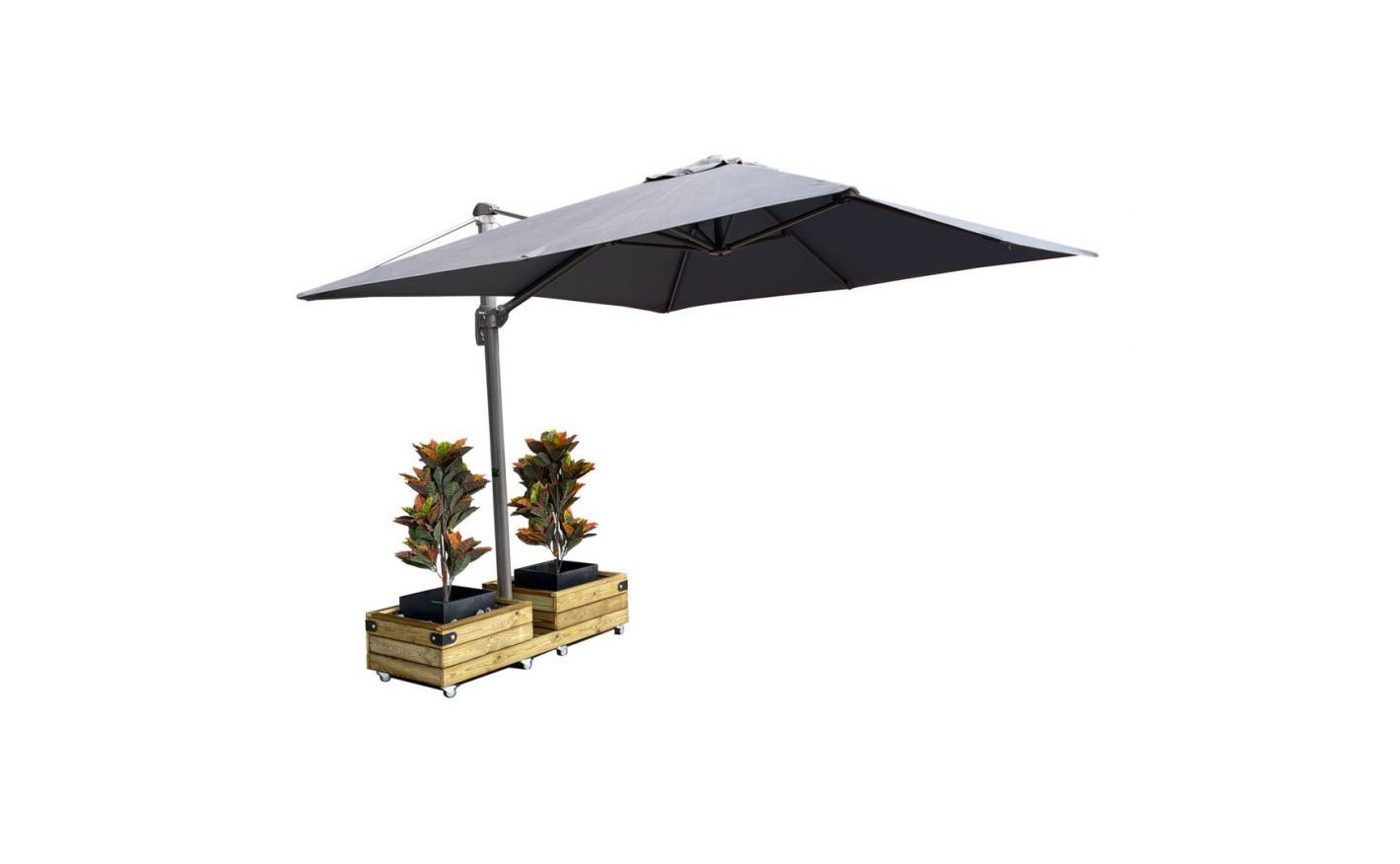 Es una base para sombrillas de pie central provista de ruedas dobles con freno que permiten un fácil movimiento y traslado de una a otra zona de la terraza. Fabricada con madera de pino rojo tratada para el exterior y tornillería de acero inoxidable. En su interior se encuentran 20 kg. de piedras canto rodado. El peso total de la base es de 35 kg.