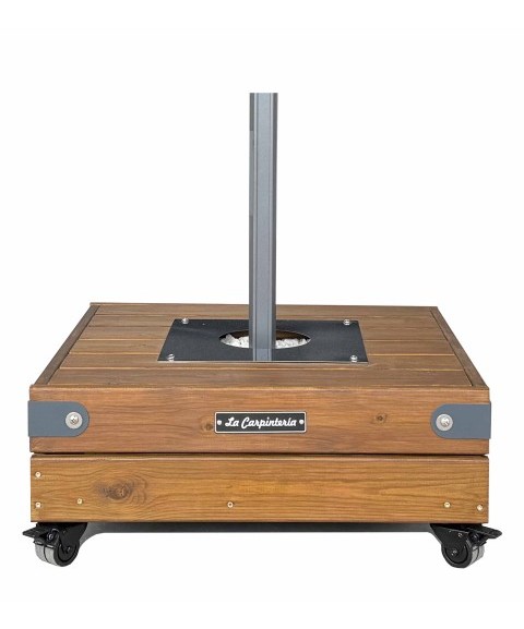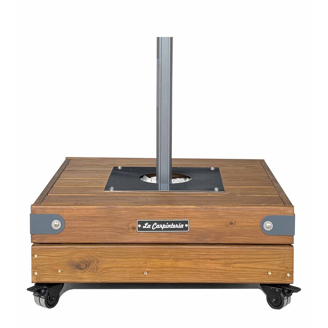 Alcanza los 75 kgs. En ella se puede acoplar cualquier sombrilla de pie lateral o central gracias a sus placas de acople universal. Incorpora de serie 4 ruedas dobles con capacidad para 90 kg/por rueda (720 kgs.), lo cual garantiza la resistencia de las ruedas para desplazar la base y el parasol. Si la prefiere sin ruedas pueden ser retiradas o bien adquirirla ya sin ellas. En ese caso, consulte precio.