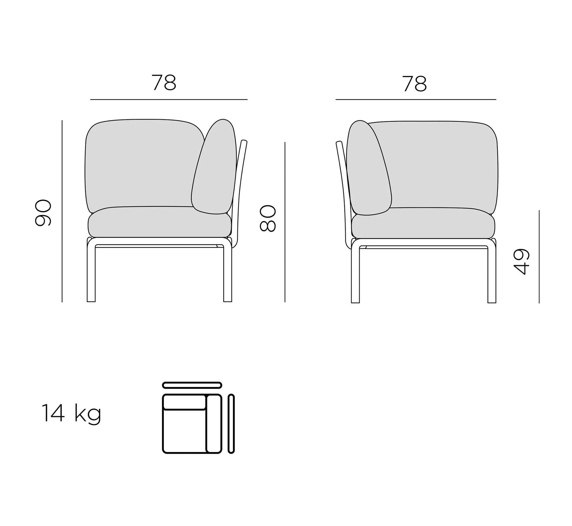 - Largo: 78 cm / Ancho: 78 cm / Alto: 90 cm.